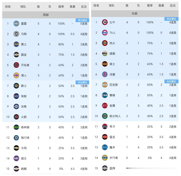 目前,NBA新赛季已经展开了近5轮的争夺,最新排名如下: