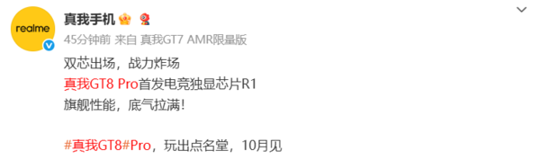 【CNMO科技消息】CNMO注意到,9月25日,真我手机官方正式宣布,真我GT8 Pro将率先搭载第五代骁龙8至尊版移动平台,并首发电竞独显芯片R1,以“王炸双芯”的硬核配置颠覆行业想象。同时,新机计划于今年10月正式发布。另外,真我GT8 Pro将配备一块2K直屏富投恒盈,后置一颗2亿像素潜望长焦镜头。